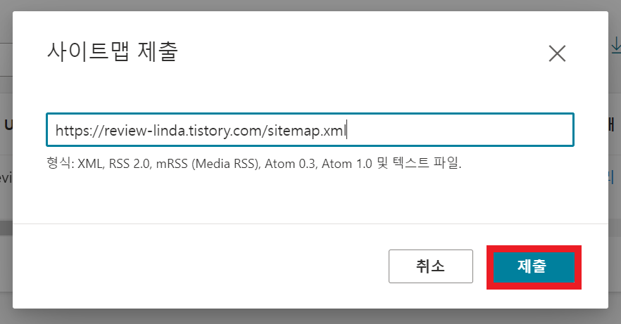 RSS 제출의 경우 본인 블로그 주소/rss를 입력한 후 제출을 눌러주면 됩니다.