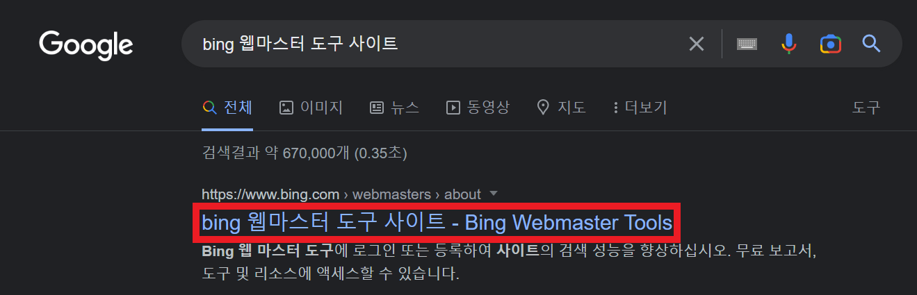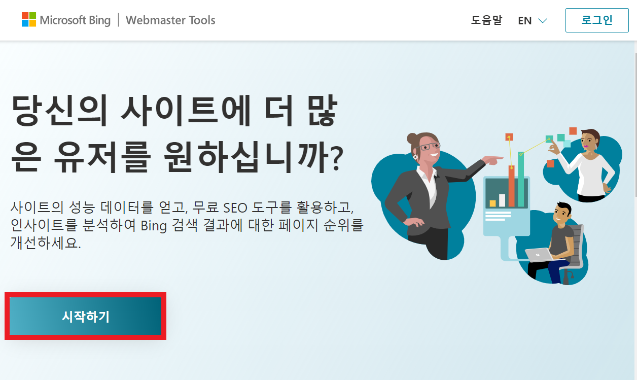 검색 창에 bing 웹마스터 도구 사이트를 검색하거나 아래의 링크를 클릭하여 bing 웹마스터 도구 사이트에 접속합니다.
