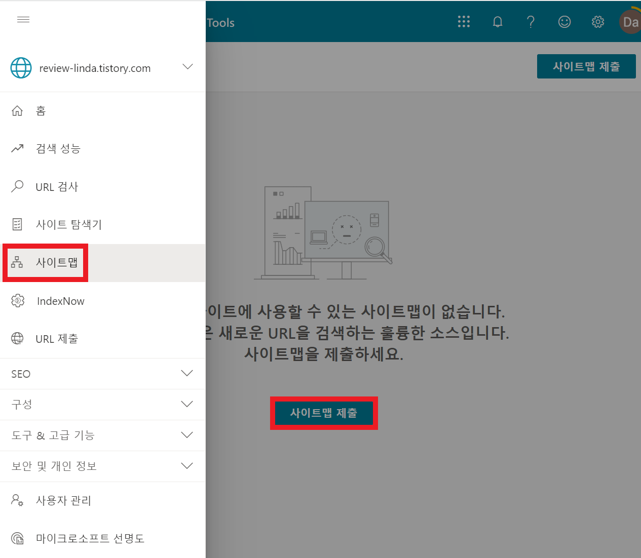 bing 웹마스터 도구 메뉴에서 사이트맵을 클릭하면 RSS와 사이트맵을 제출할 수 있습니다.