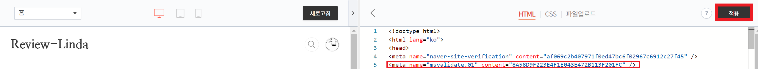 <head> 태그 안에 복사한 HTML 메타 태그를 붙여 넣은 후 적용을 클릭합니다.