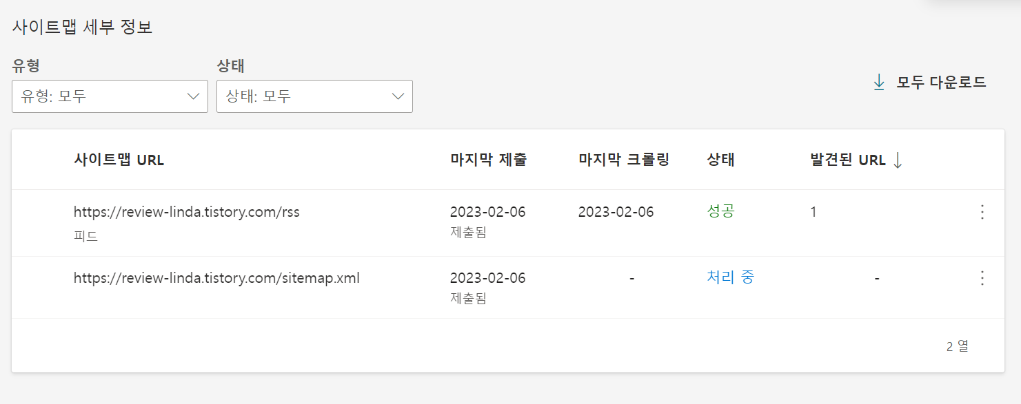 사이트맵 제출의 경우 본인 블로그 주소/sitemap.xml을 입력한 후 제출을 눌러주면 됩니다.