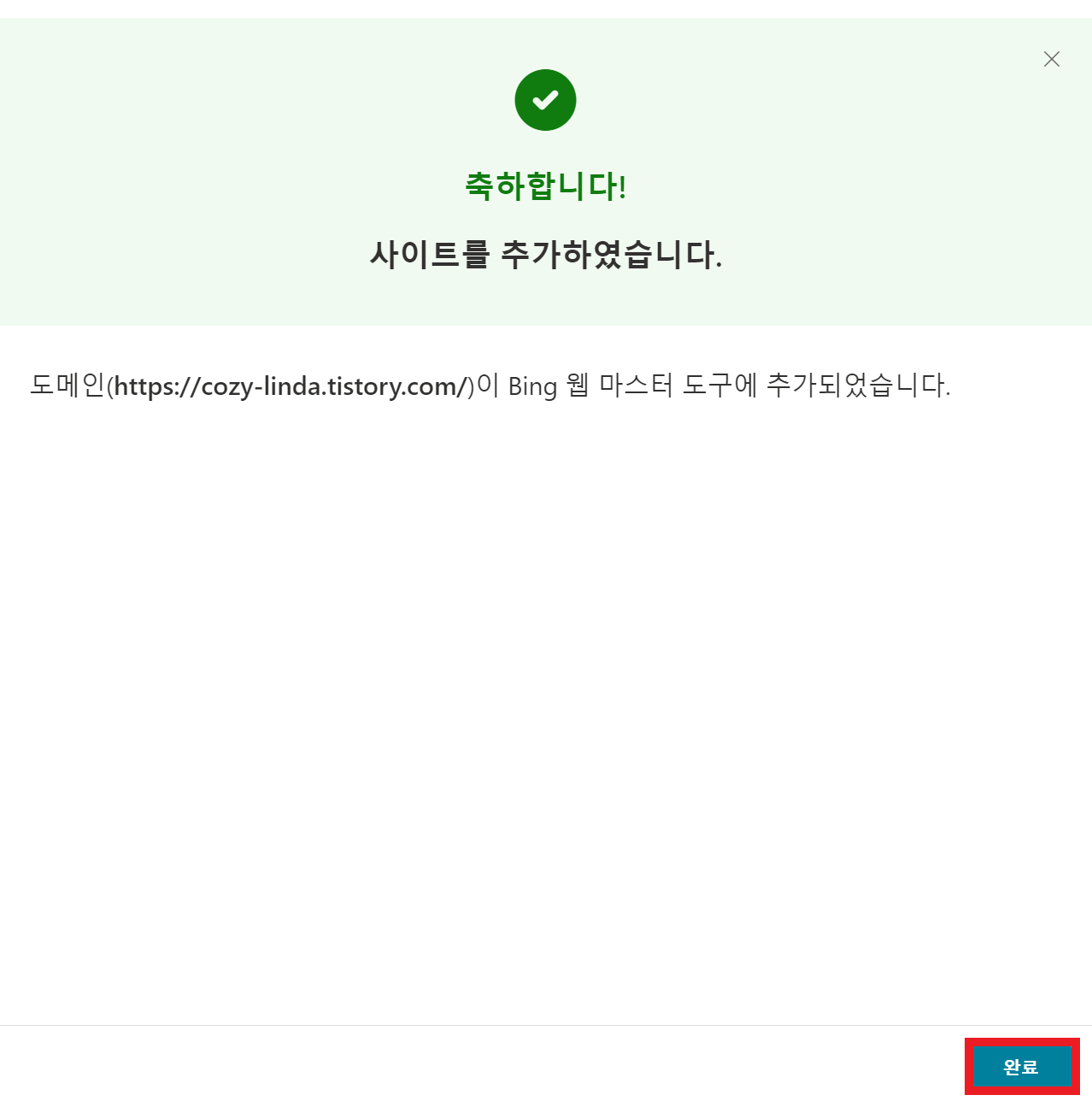 그러면 소유권 인증 절차를 통해 사이트를 추가하였습니다 라는 창이 뜨게 되며, 완료를 클릭하면 사이트 등록은 끝납니다.