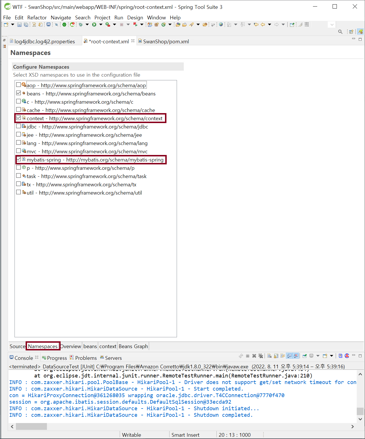 root-context.xml 파일을 연 후 하단의 Namespace를 클릭해서 해당 창을 열고, context, mybatis-spring을 체크하여 저장합니다.