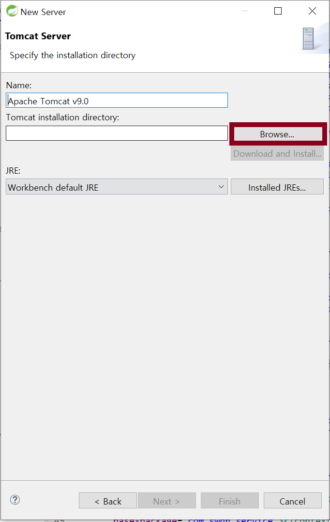 Browse를 클릭하여 자신이 톰캣을 설치한 경로를 선택해준 후 Finish 클릭합니다.