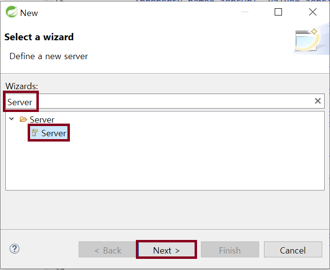 상단 내비게이션 바에서 File 클릭 → New 클릭 → Other 클릭 후 Wizards란에 Server를 입력 → Server를 선택 → Next > 클릭