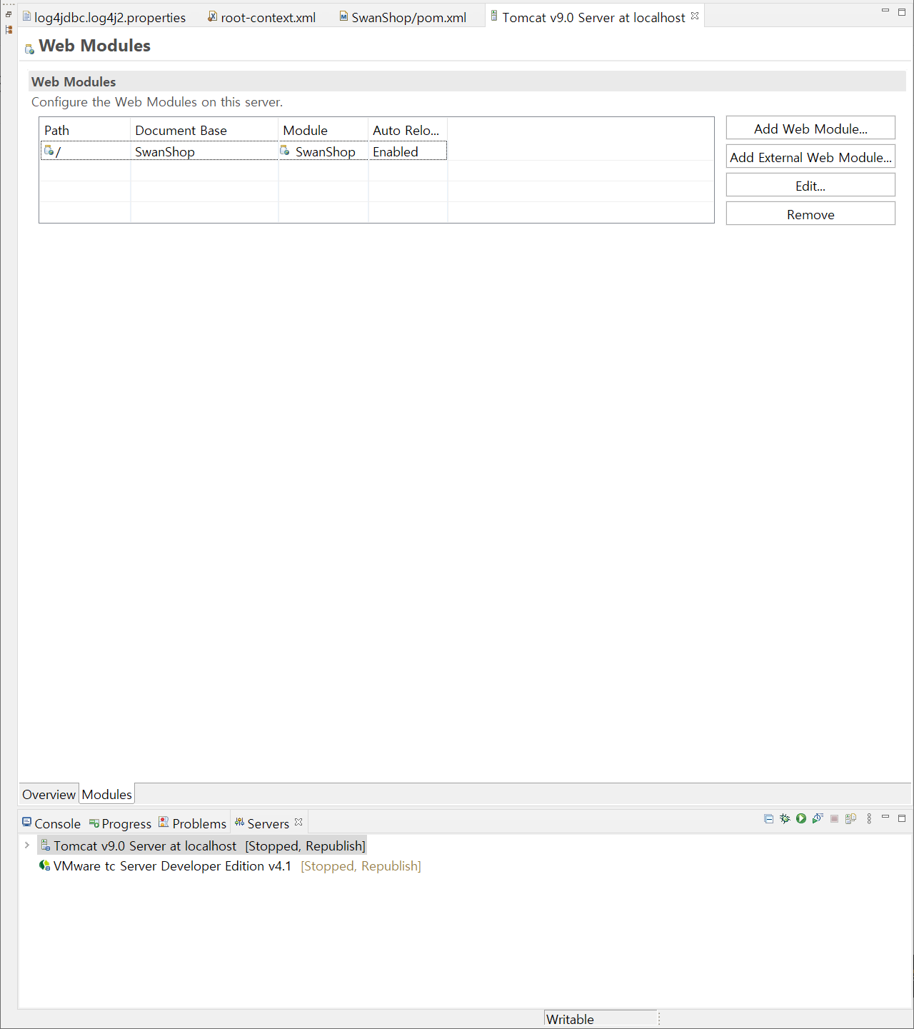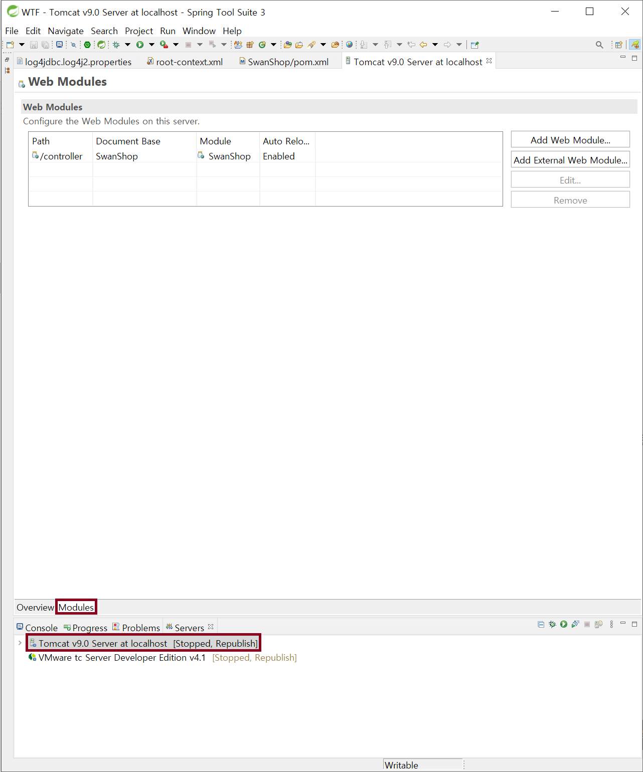 Servers 창에 있는 Tomcat v9.0 at localhost... 를 더블 클릭하여 창을 띄운 후, 하단의 Modules 탭을 클릭합니다.