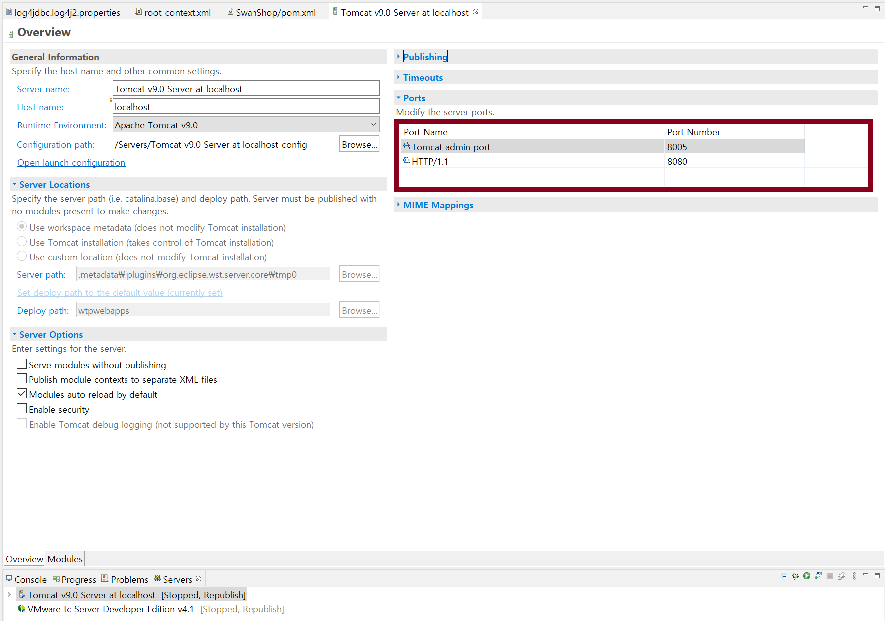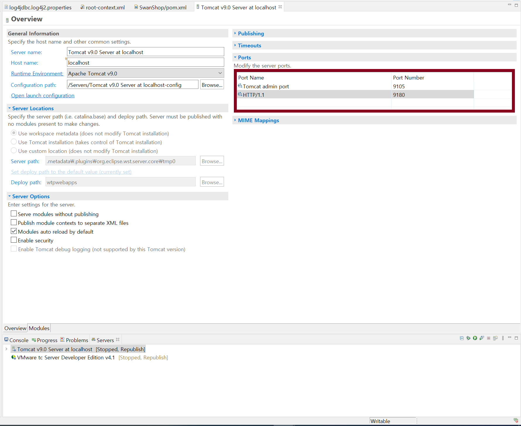 Servers 창에 있는 Tomcat v9.0 at localhost... 를 더블 클릭하여 창을 띄운 후, 하단의 Modules 탭을 클릭합니다.
