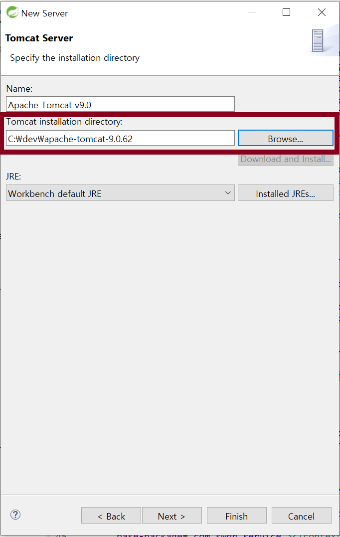 (저는 9.0 버전을 설치했기 때문에 Tomcat v9.0 Server를 선택했습니다.)
