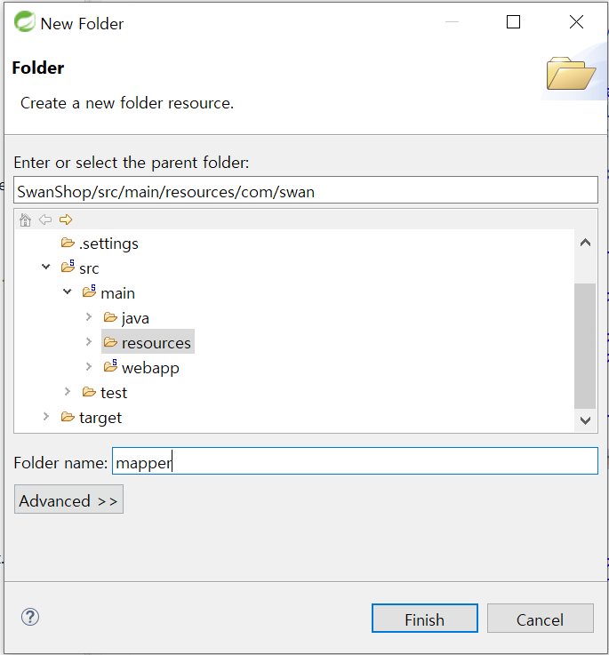 src/main/resources 경로에 mapper 패키지 명(com.swan.mapper)과 동일한 폴더 경로를 생성합니다.