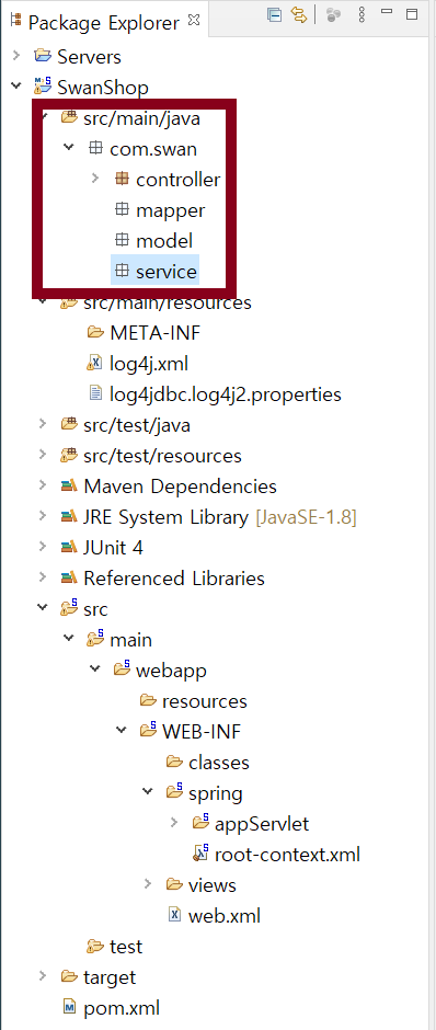 - com.swan.service : Service 패키지입니다. Mapper와 Controller 사이를 연결해주는 역할을 합니다.