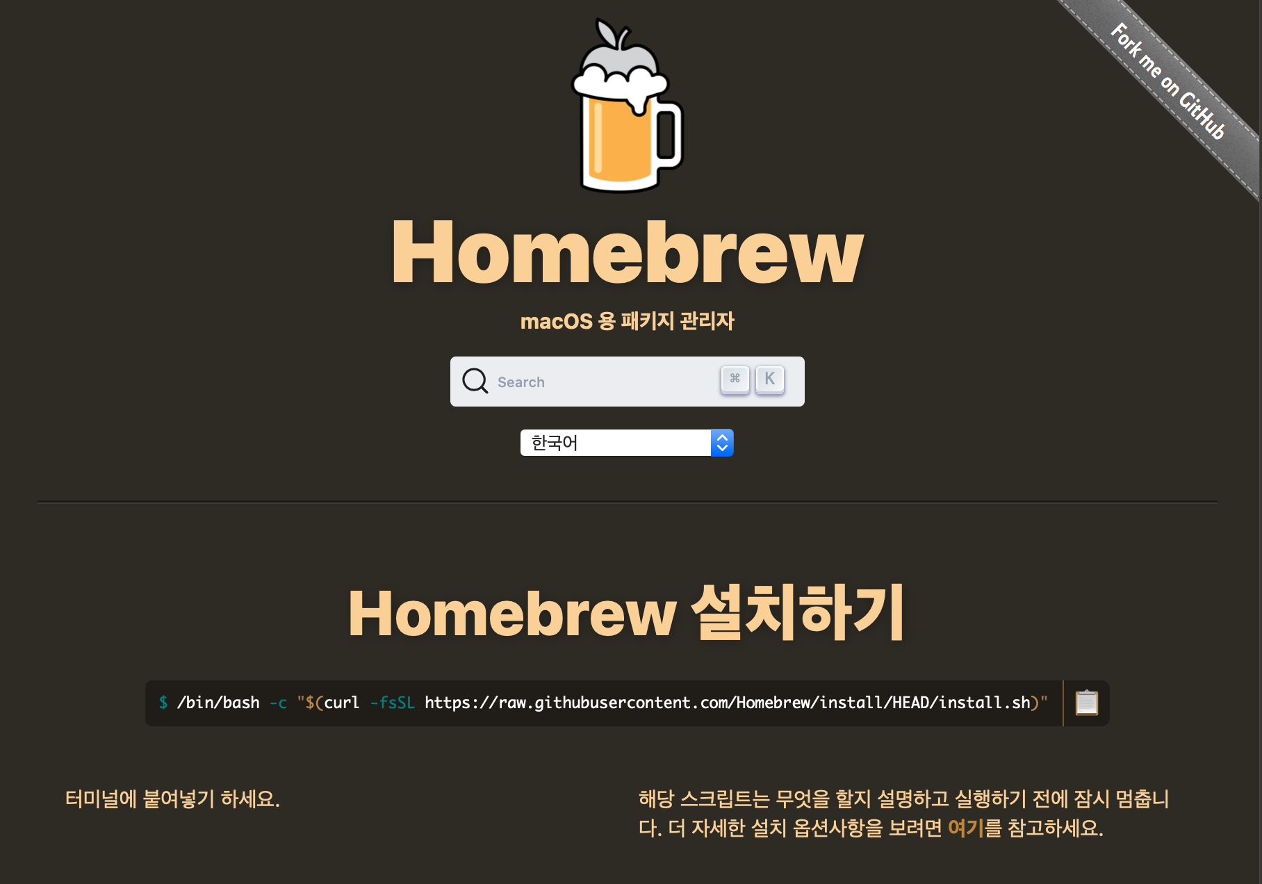 검색창에 Homebrew라고 검색하거나 아래의 링크를 클릭합니다.