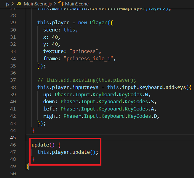 Player 안에 키보드 입력 이벤트를 갖게 하기 위해서 MainScene.js 파일의 update()를 Player.js 파일로 옮겨줍니다.