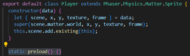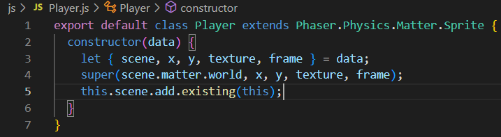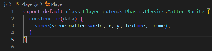 Player.js 파일에 Player라는 클래스가 Phaser.Physics.Matter.Sprite를 확장할 수 있도록 코드를 작성합니다.