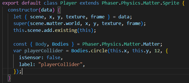 var playerCollider = Bodies.circle(this.x, this.y, 12, { isSensor: false, label: 'playerCollider' });