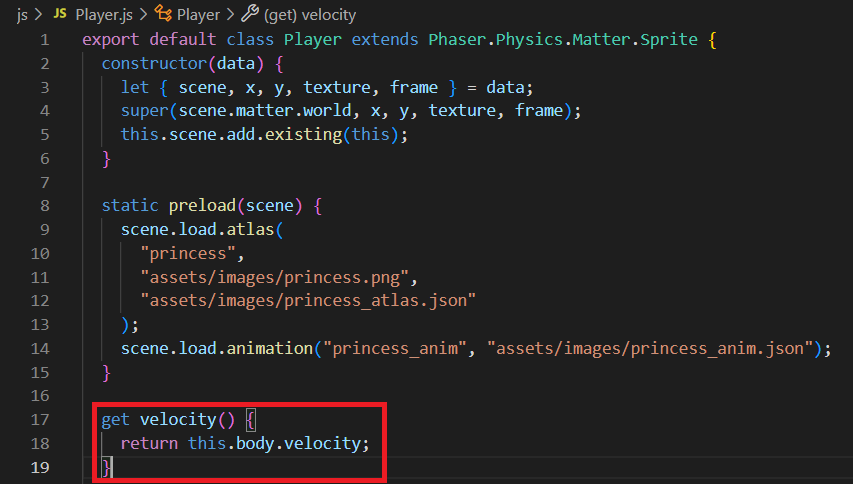 그래서 속도에 대한 get velocity()를 생성하여 해당 player 몸체 속도를 반환받을 수 있도록 코드를 추가해야 합니다.