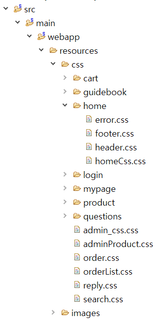 저는 css 파일을 jsp와 분리했기 때문에 src/main/webapp/resources아래 css 폴더를 만들었습니다. 해당 경로 아래 home 폴더를 생성하고 메인 페이지에 해당하는 css 만들었습니다. 또한 메인 페이지에서 보일 이미지를 저장 하는 src/main/webapp/resources아래 images 폴더를 생성했습니다.