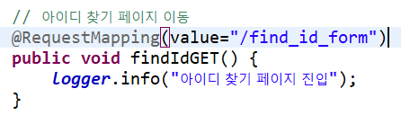 폼 생성 이후 MemberController.java에 아이디 찾기 버튼 클릭 시 아이디 찾기 폼으로 이동시키기 위한 코드를 추가합니다.