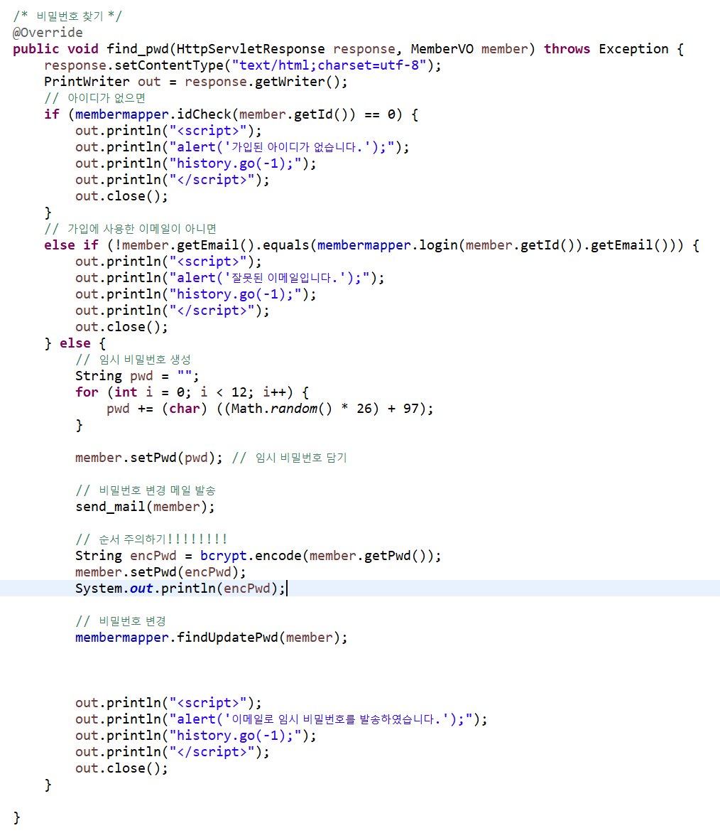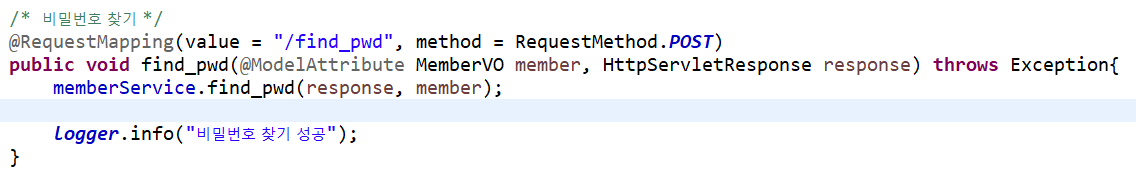 4. MemberController.java에 비밀번호 찾기 버튼 클릭 시 실행될 로직 작성