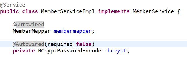 먼저 MemberServiceImpl.java 클래스의 상단에 BCryptPasswordEncoder에 대한 의존성을 주입해줍니다.