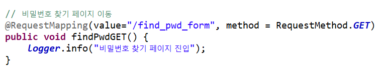 1. MemberController.java에 비밀번호 찾기 폼으로 이동하기 위한 코드 작성