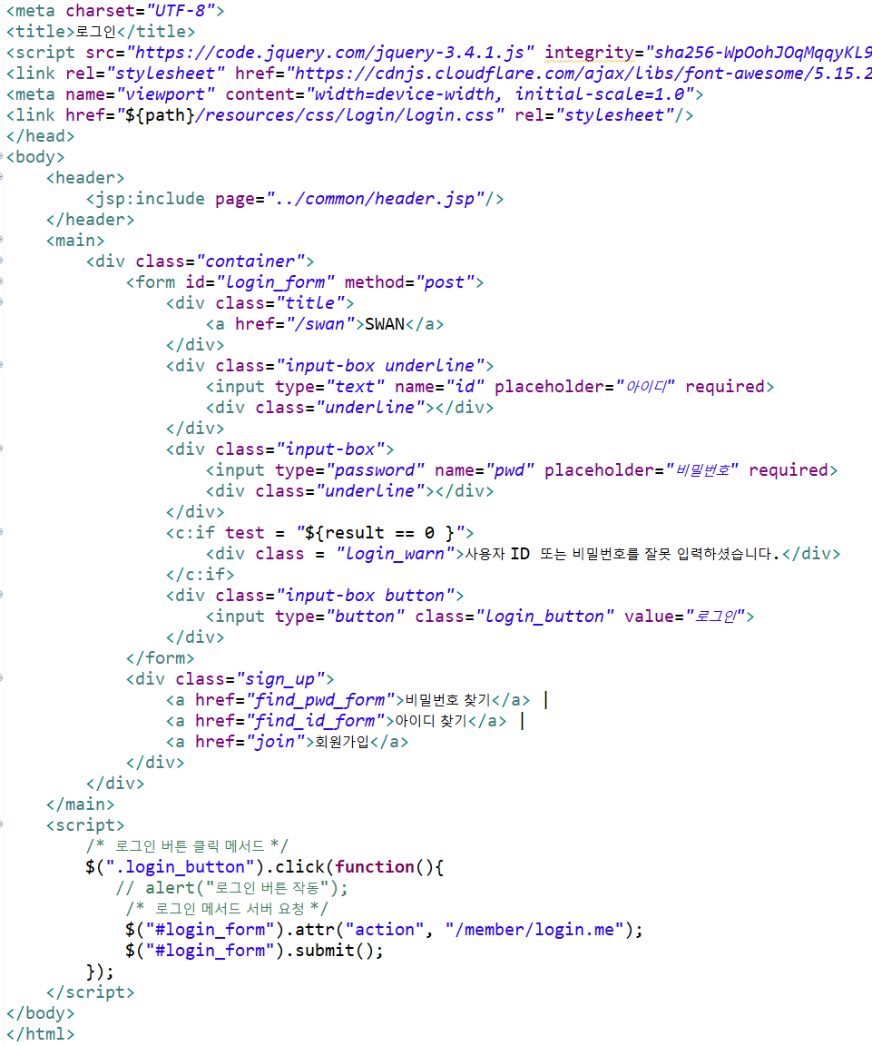 변경 한 곳은 MemberController.java의 @RequestMapping 부분, login.jsp에 있는 <script> 태그 내의 서버에 로그인을 요청하는 곳입니다.