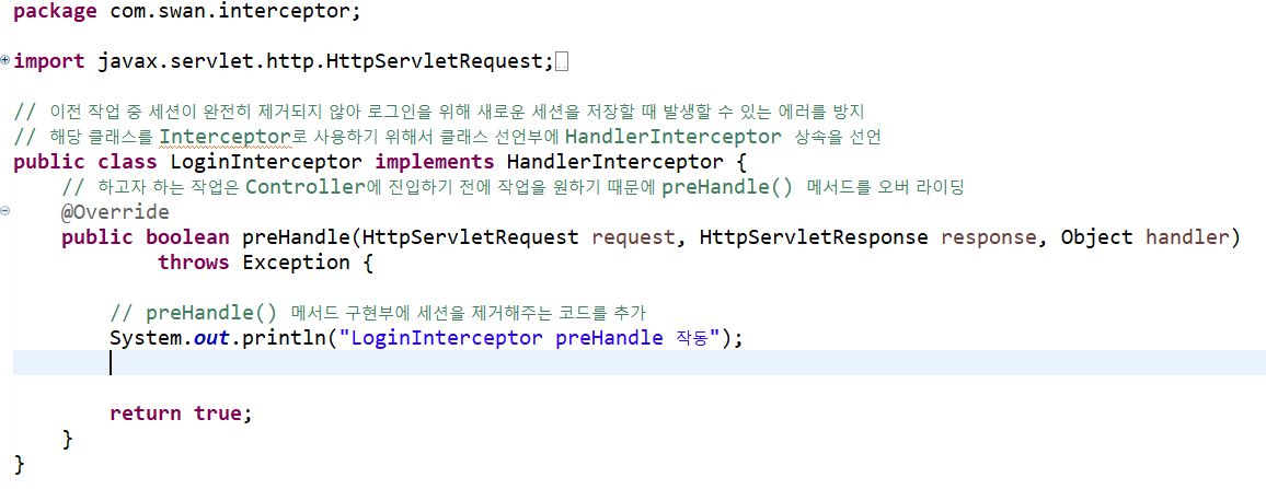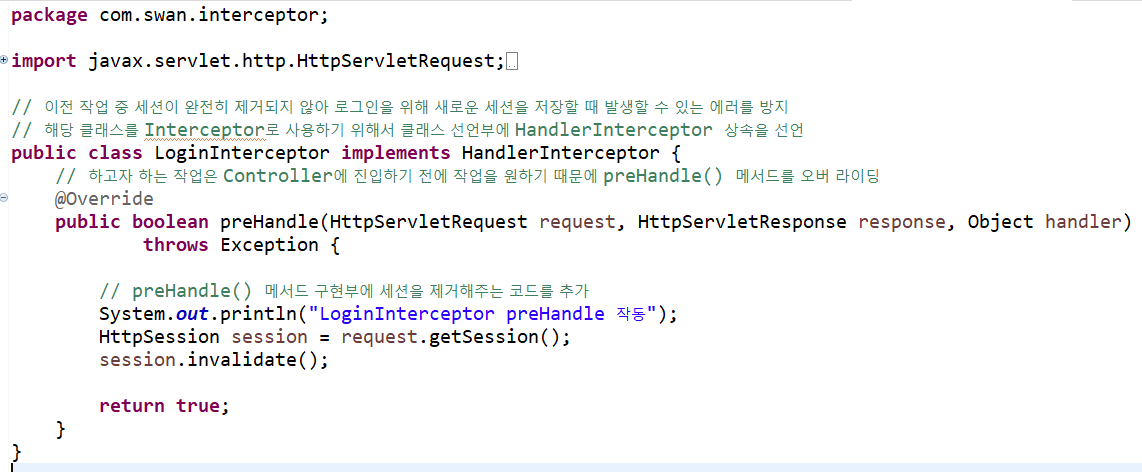 LoginInterceptor.java와 동일하게 HandlerInterceptor 클래스를 상속시키고 preHandle() 메서드를 오버 라이딩합니다.