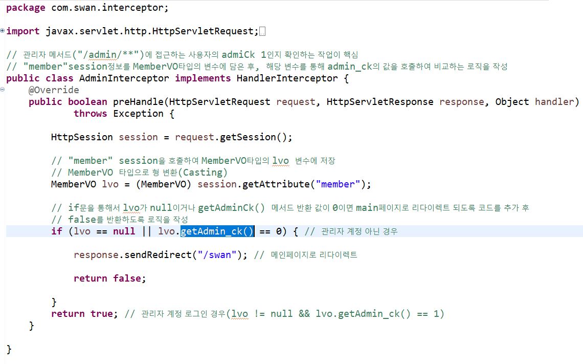 if문을 통해서 lvo가 null이거나 getAdmin_ck() 메서드 반환 값이 0이면 swan 페이지로 리다이렉트 되도록 코드를 추가 후 false를 반환하도록 로직을 작성합니다.