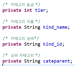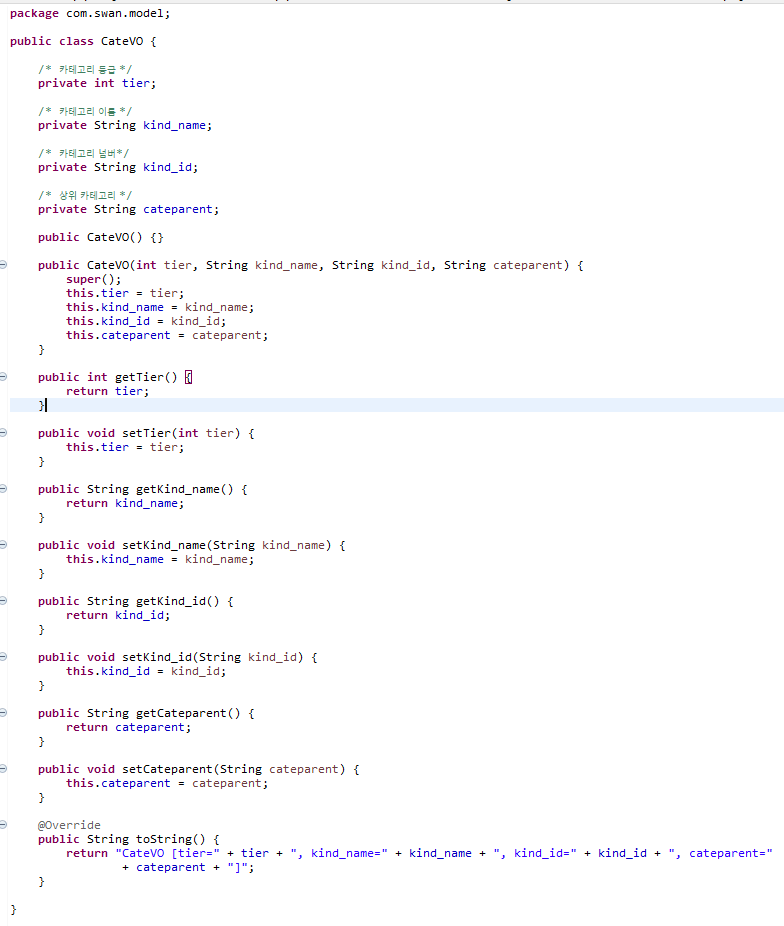 com.swan.model 패키지에 CateVO.java 클래스를 생성한 뒤 아래의 변수들을 추가해줍니다.