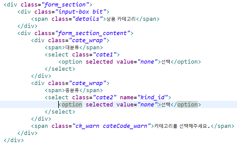 그리고 최종적으로 '중분류'를 선택하는 것은 상품 등록에 필요로 한 "kind_id" 데이터를 선택하는 것이기 때문에 '중분류'의 <select> 태그에 name속성을 부여하였습니다.