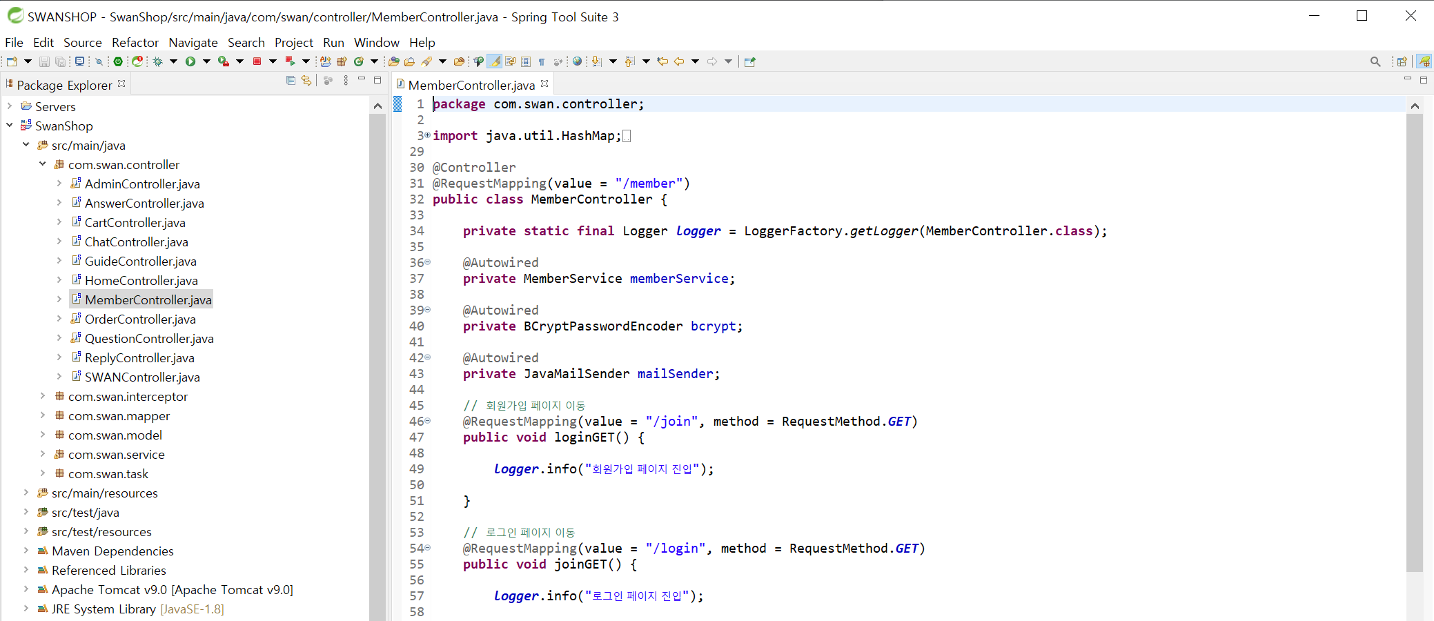기존 SWANController 클래스가 있지만 회원과 관련된 요청을 따로 관리하기 위해 src/main/java/com.swan.controller 경로에 MemberController 클래스를 만들어줍니다.