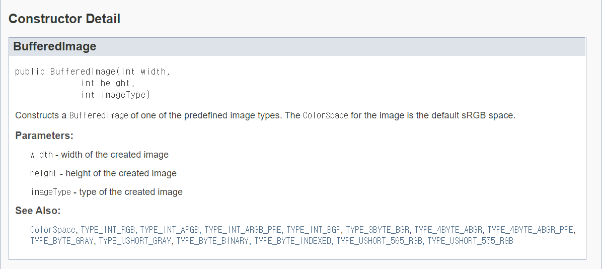 사용한 BufferedImage 생성자의 매개 변수로 (차례대로) '너비', '높이', '생성될 이미지 타입'을 작성합니다.
