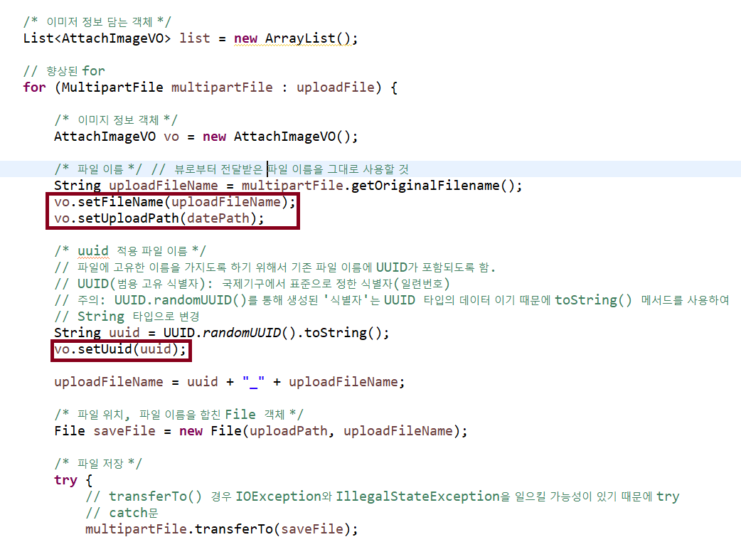 이렇게 하면 이미지를 전달받은 만큼 AttachImageVO 객체가 생성되어 각 정보를 저장한 후 해당 객체가 List의 요소로 추가됩니다.