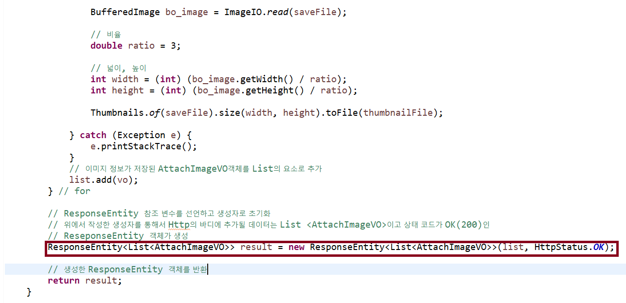 구현부 제일 하단엔 return 문을 추가하여 생성한 ResponseEntity 객체를 반환합니다.