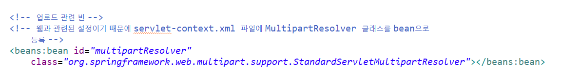 <!-- 웹과 관련된 설정이기 때문에 servlet-context.xml 파일에 MultipartResolver 클래스를 bean으로 등록 -->
