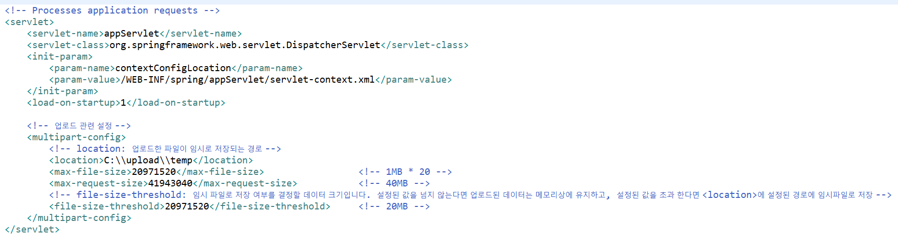 저는 web.xml을 사용하고 있기 때문에 web.xml에서 업로드를 사용하기 위한 기본적인 설정을 추가했습니다.