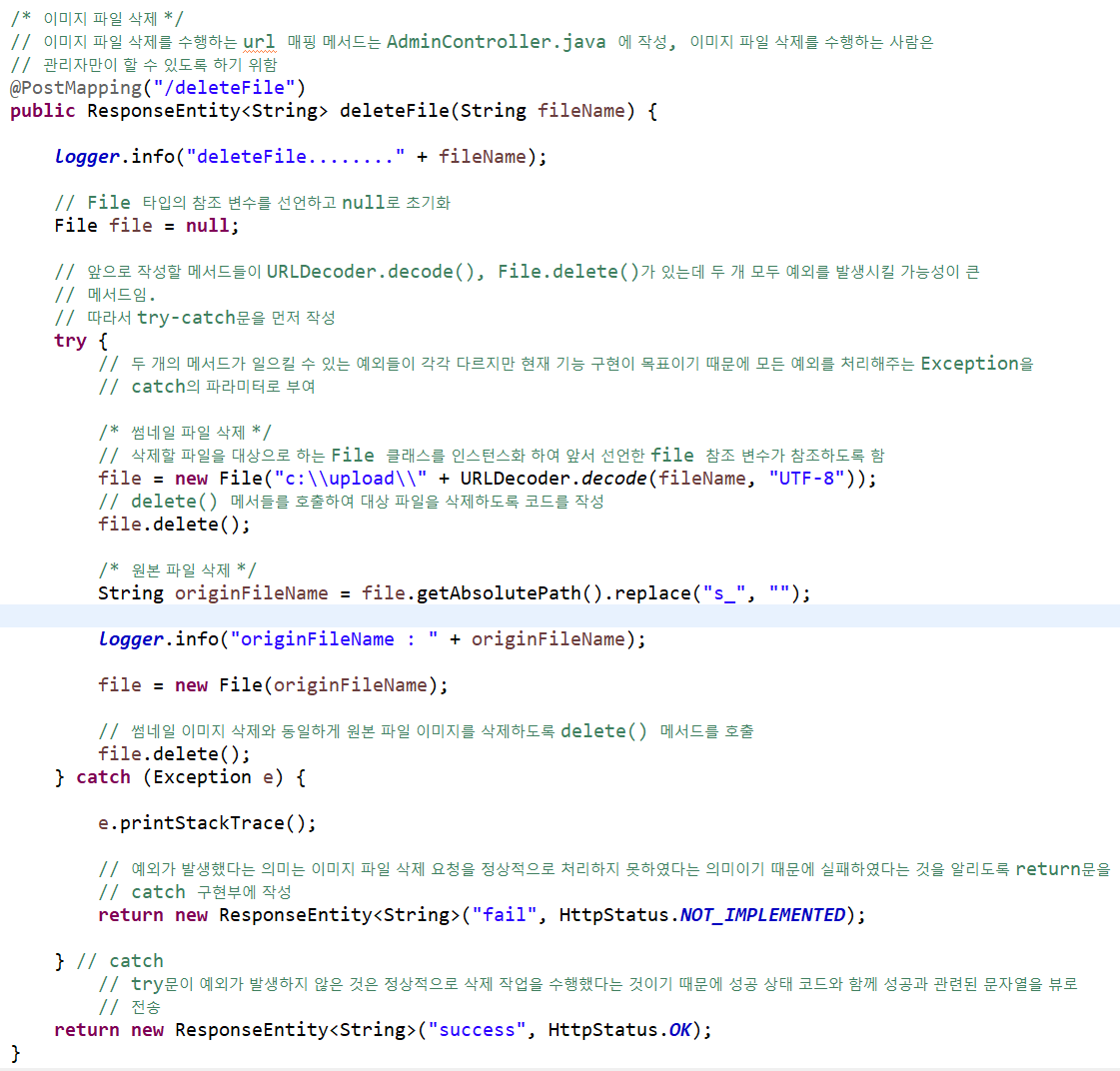 이미지 파일 삭제를 수행하는 URL 매핑 메서드는 AdminController.java에서 작성했습니다. 이는 이미지 파일 삭제를 관리자만 할 수 있게 하기 위함입니다.