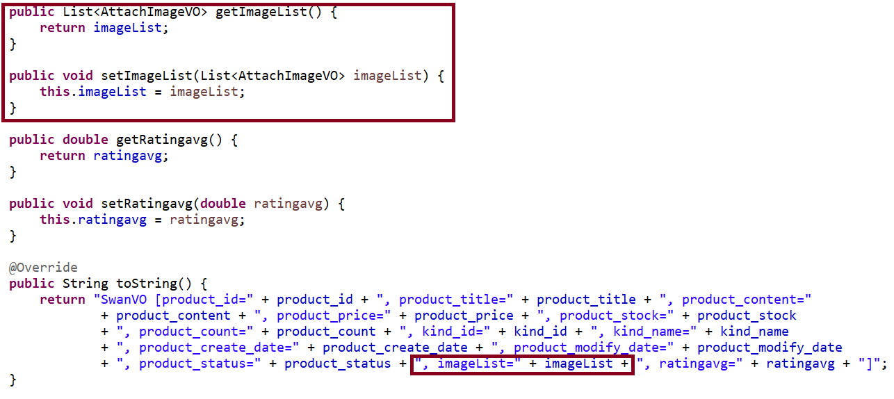 추가한 imageList 변수의 getter/setter 메서드를 작성하고, toString() 메서드에 imageList 변수를 추가해줍니다.