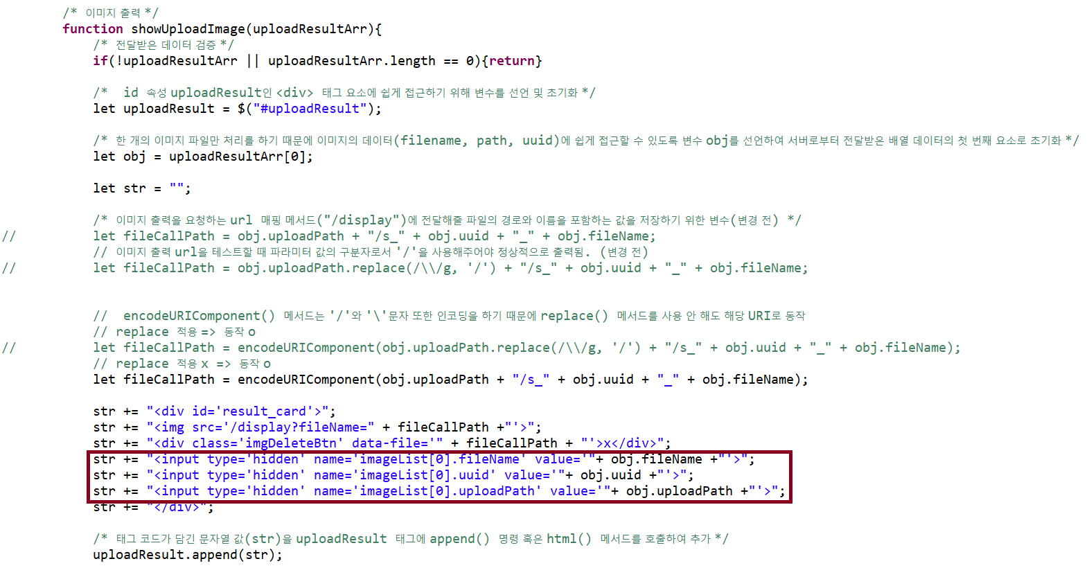 - 이미지 정보에 대한 <input> 태그는 JavaScript를 통해 동적으로 추가 → 이미지가 등록되었을 때만 서버에 이미지에 대한 정보를 전달해야 하기 때문