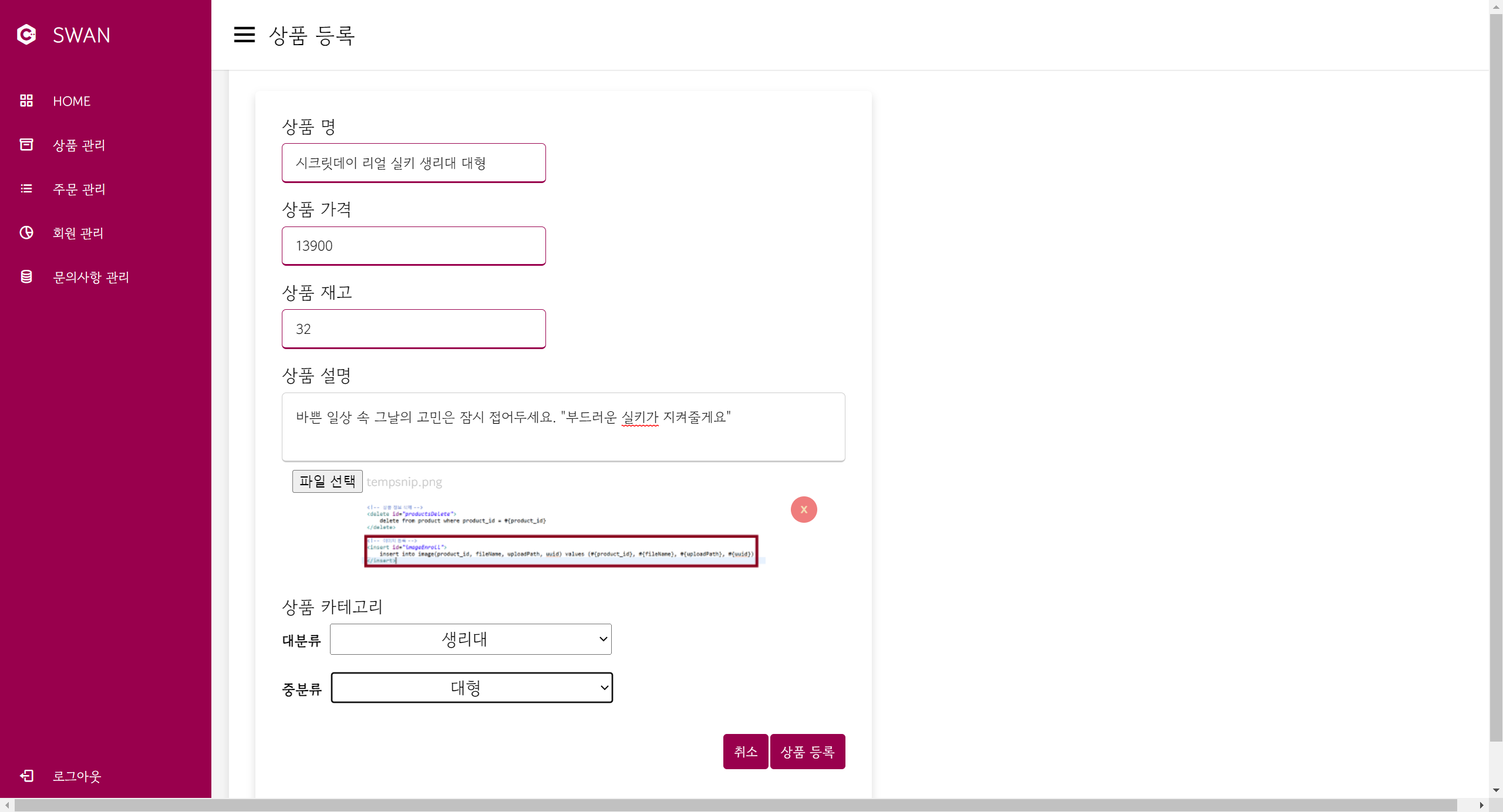 이미지 등록에 필요한 product_id 값을 세팅 후, Mapper 단계의 imageEnroll() 메서드를 호출하고 매개변수로 SwanVO의 imageList 요소를 매개변수로 부여했습니다.