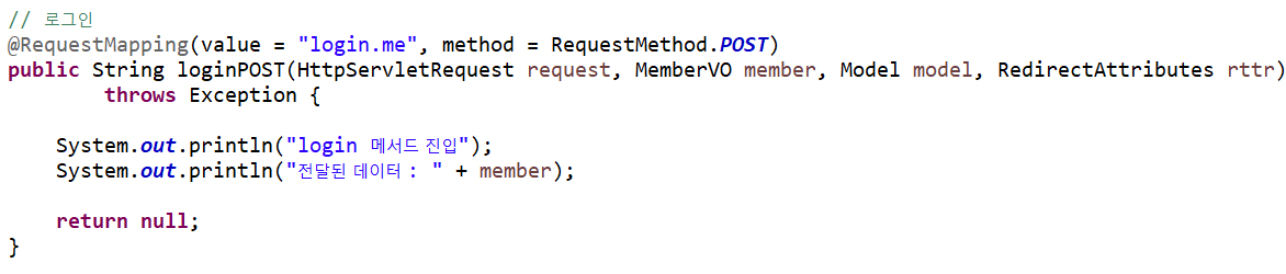 파라미터로는 MemberVO, HttpServletRequest, RedirectAttributes를 사용합니다.