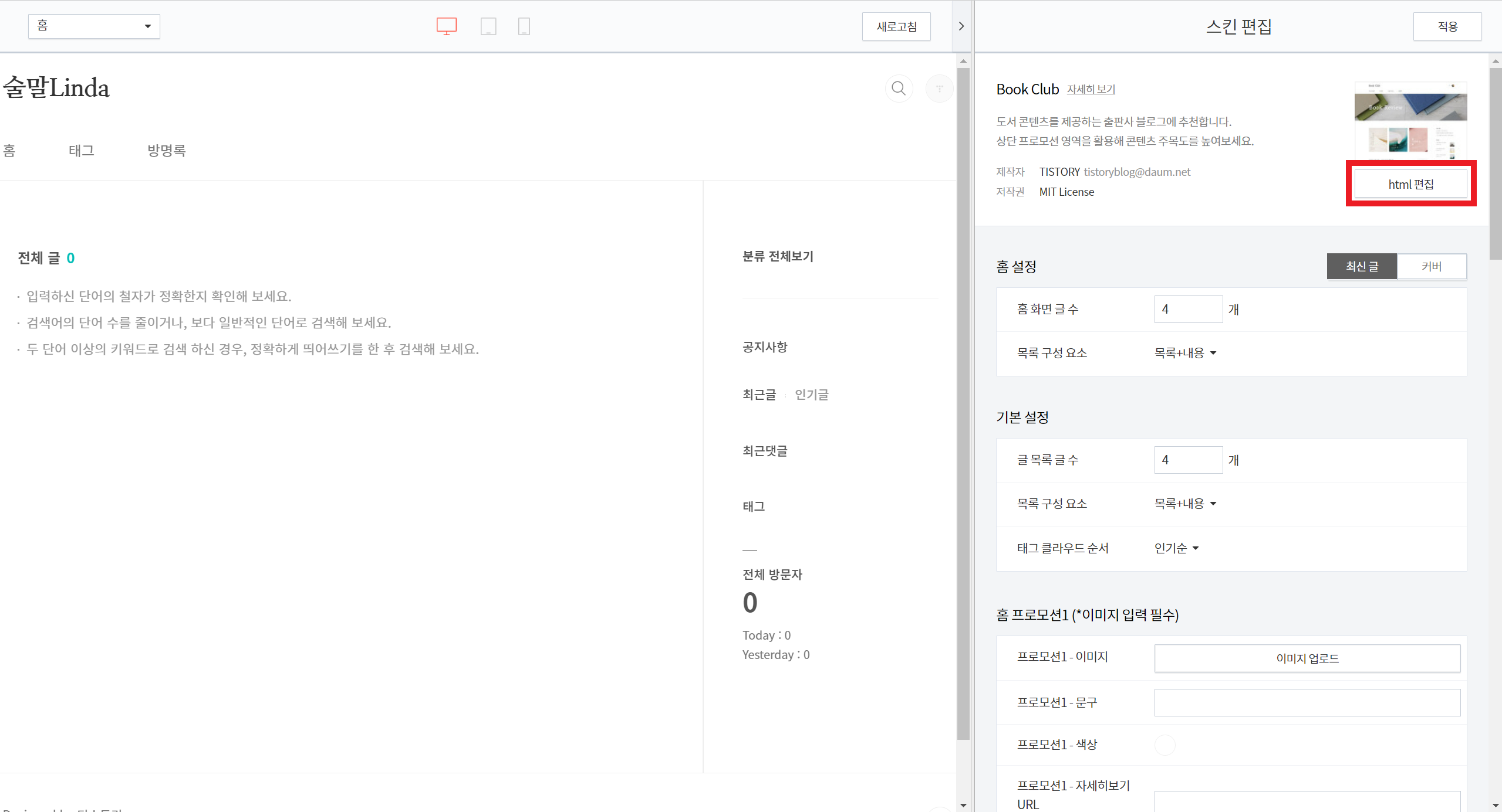 스킨 편집창이 뜨면 오른쪽 상단에 위치한 html편집을 클릭합니다.
