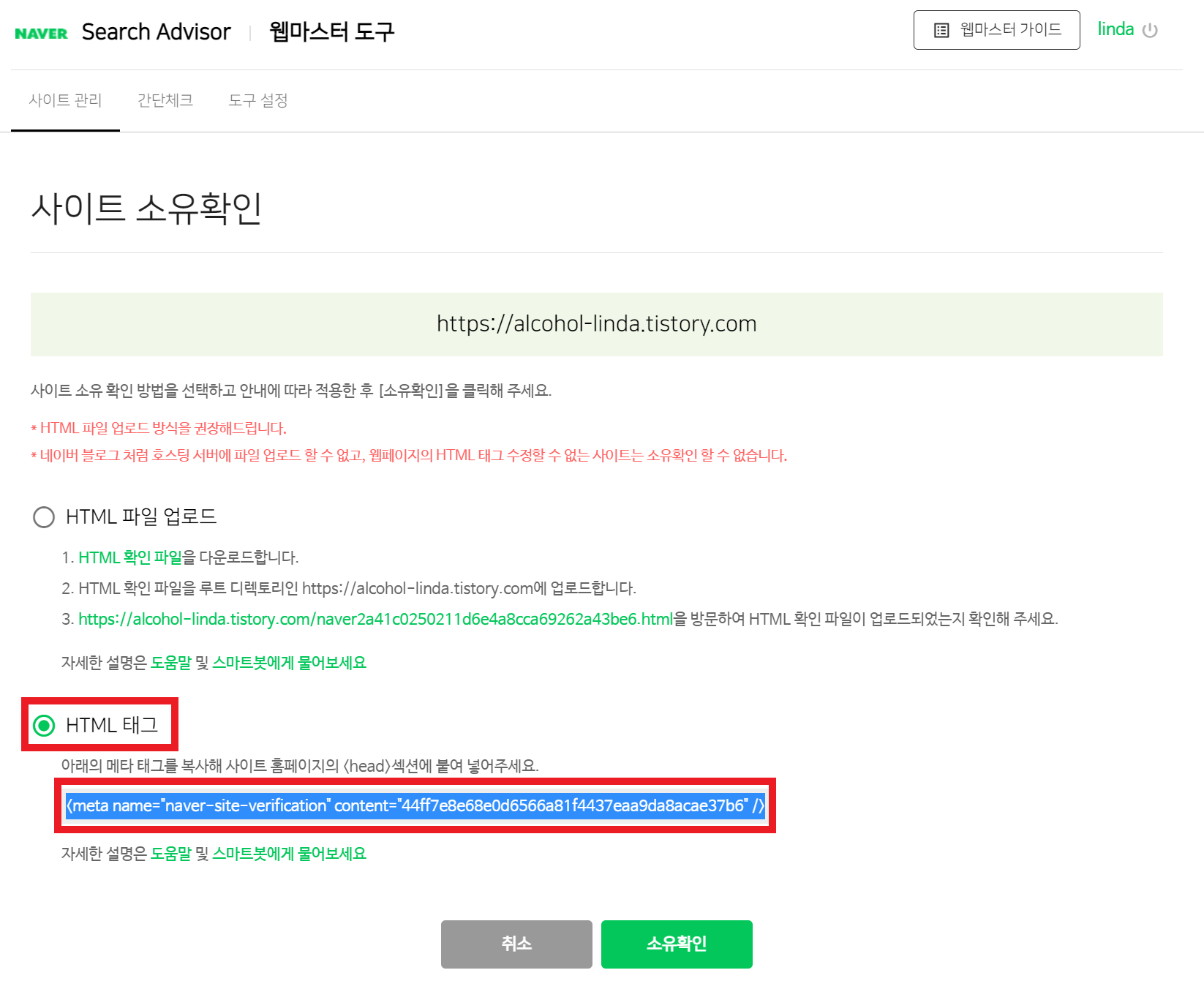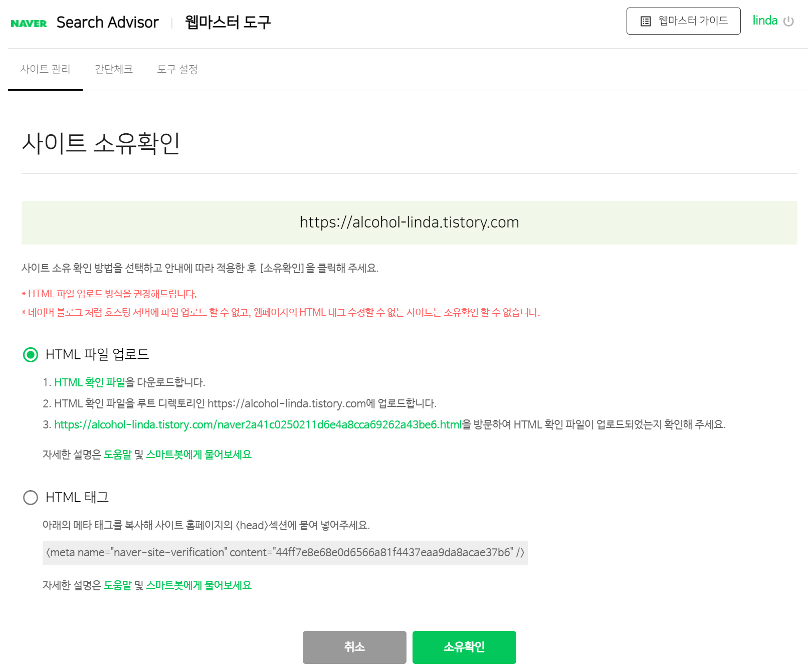 HTML 태그를 활용한 소유확인이 HTML 파일 업로드보다 훨씬 간단하기 때문에 HTML 태그를 활용하시는 걸 추천합니다.