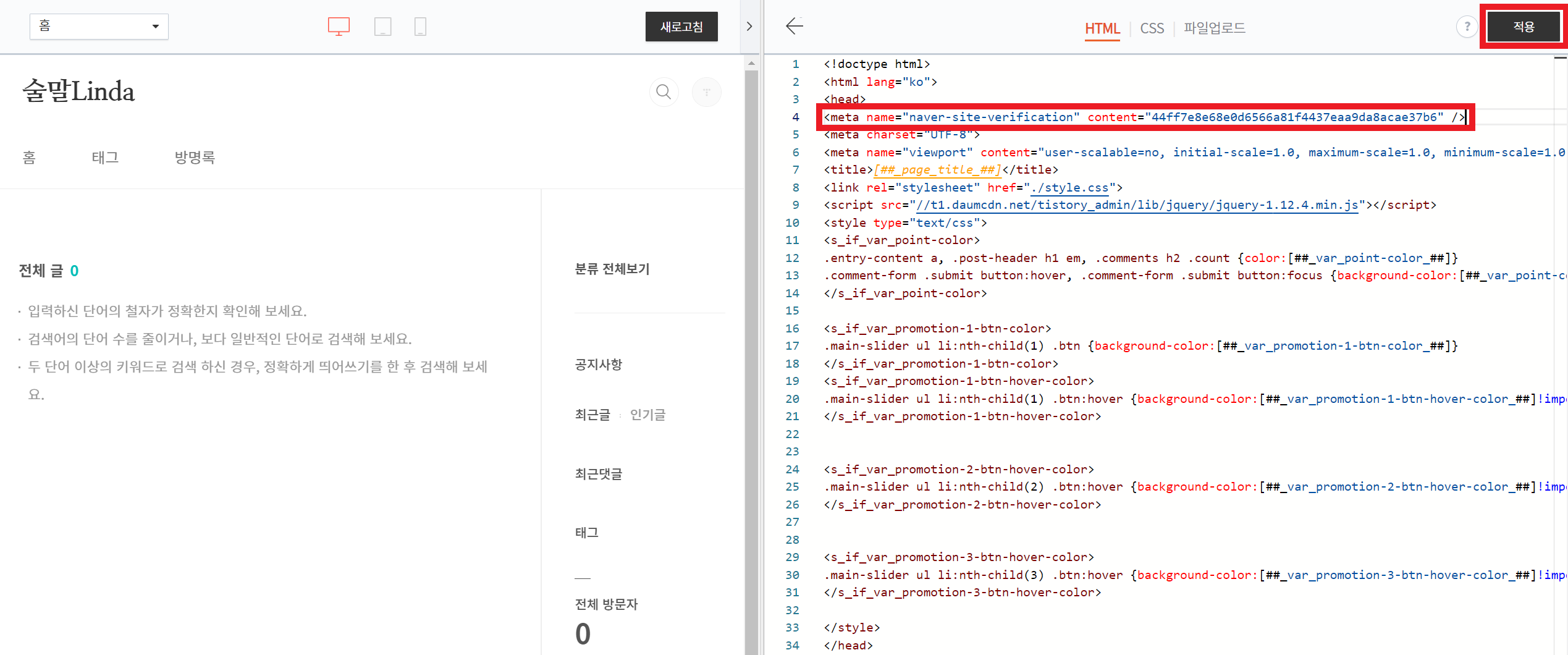 제공된 메타 태그를 해당 블로그 스킨 편집에 복사 붙여 넣기 하면 완료입니다.