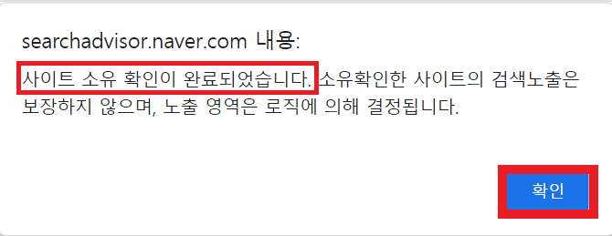 정상적으로 완료되었다면 다음처럼 사이트 소유 확인이 완료되었습니다 라는 경고창이 뜹니다.