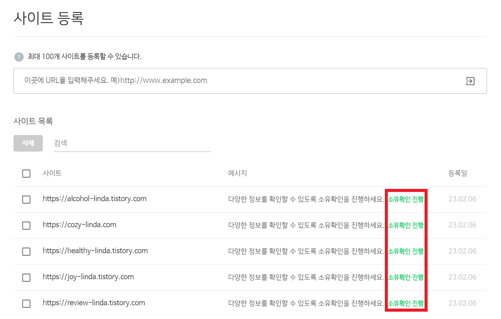 등록이 기존에 되어 있는 분들은 하단 사이트 목록에서 해당 블로그 라인의 소유확인 진행을 클릭합니다.