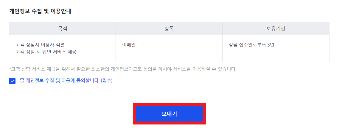 이후 줌 개인정보 수집 및 이용 동의를 체크해 주시고 보내기를 누르면 끝납니다.