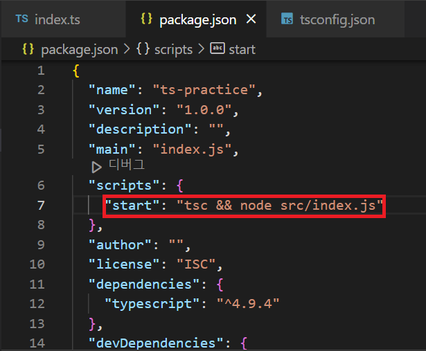 package.json 파일의 script를 아래와 같이 작성하면, 컴파일하고 실행을 한 번에 진행할 수 있습니다.