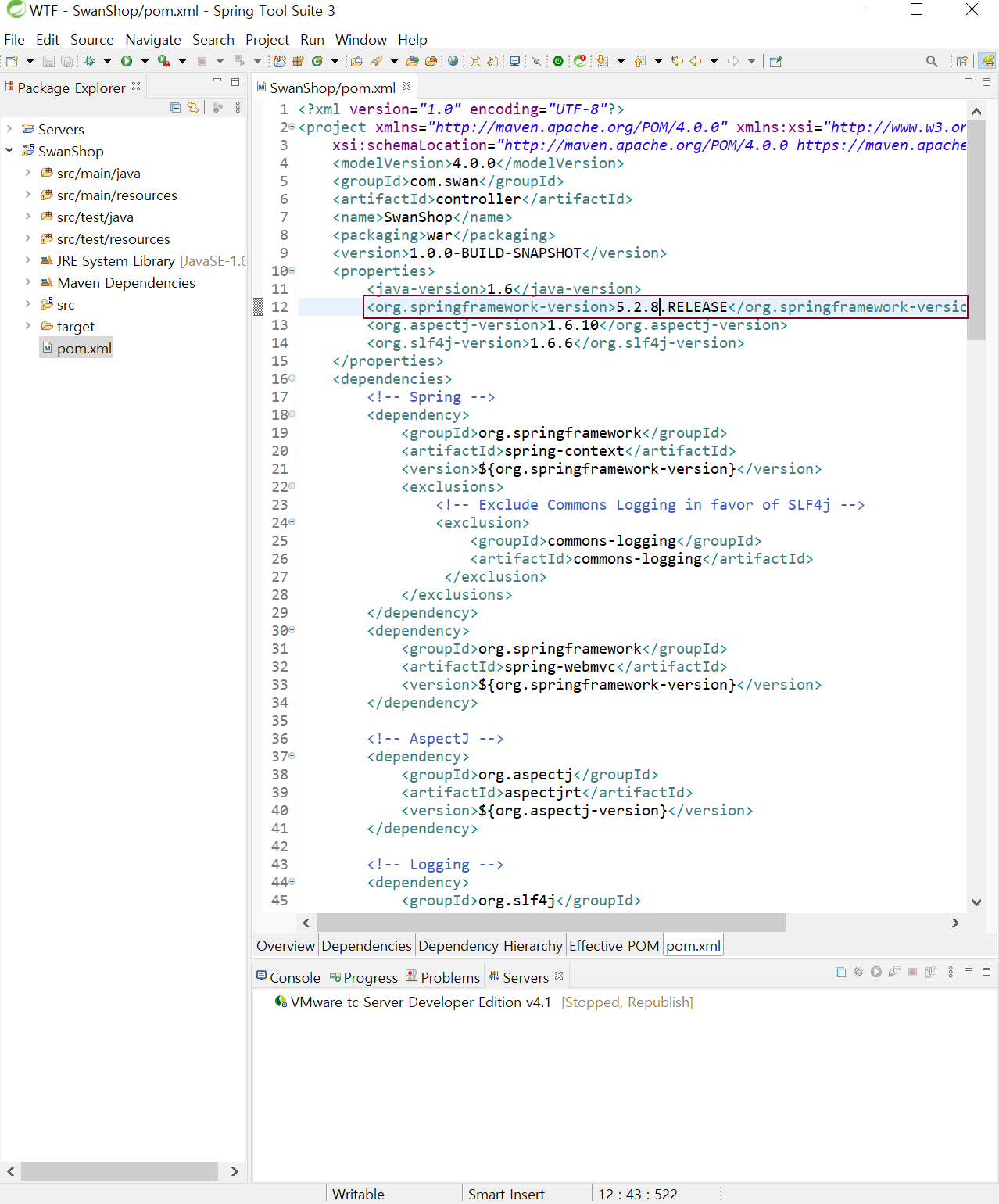<org.springframework-version> 태그에 입력된 기존 3.1.1 버전을 자신이 원하는 버전으로 변경 후 저장합니다(Ctrl + S).