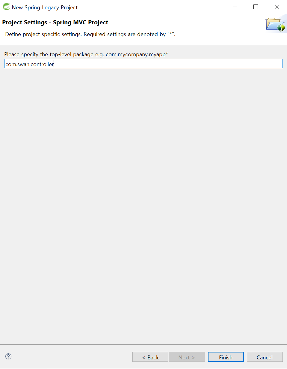 입력란에 com. '프로젝트 명 or 원하는 이름'. controller을 입력한 후 [Finish] 클릭합니다.