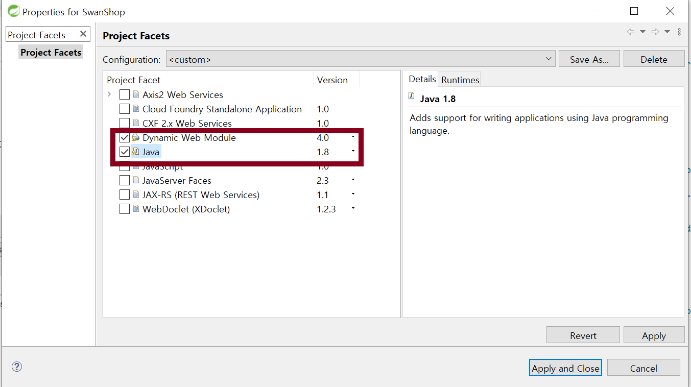 좌측 상단 검색 상자에 Project Facets를 검색하여 해당 창으로 들어간 후 Dynamic Web Module 버전을 4.0으로 Java 버전을 1.8로 변경합니다.